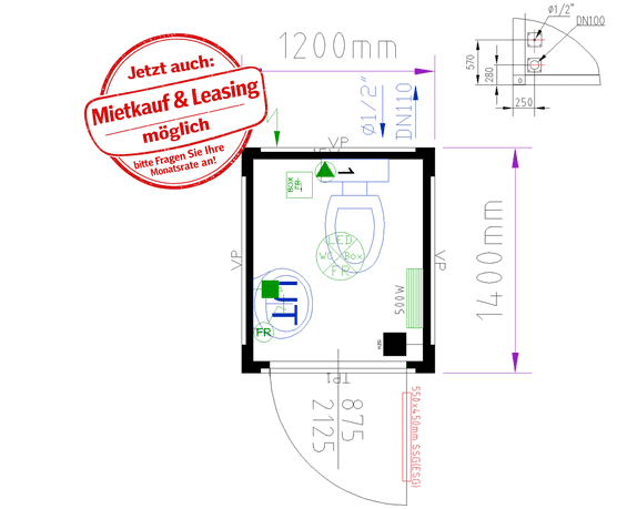 Mit WC, Waschplatz, Heizung, Lüftung und LED-Beleuchtung vereint dieser Container auf nur wenigen Quadratmetern alles, was für den hygienischen Betrieb erforderlich ist.